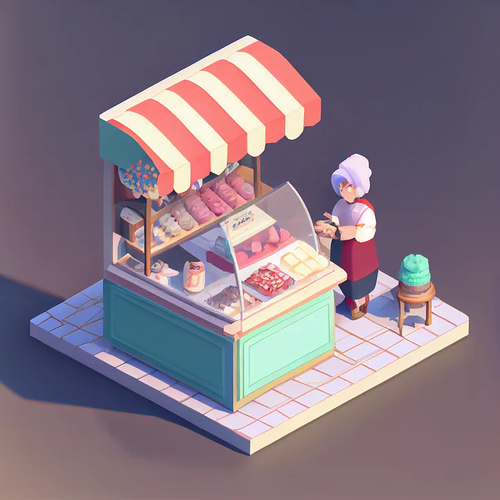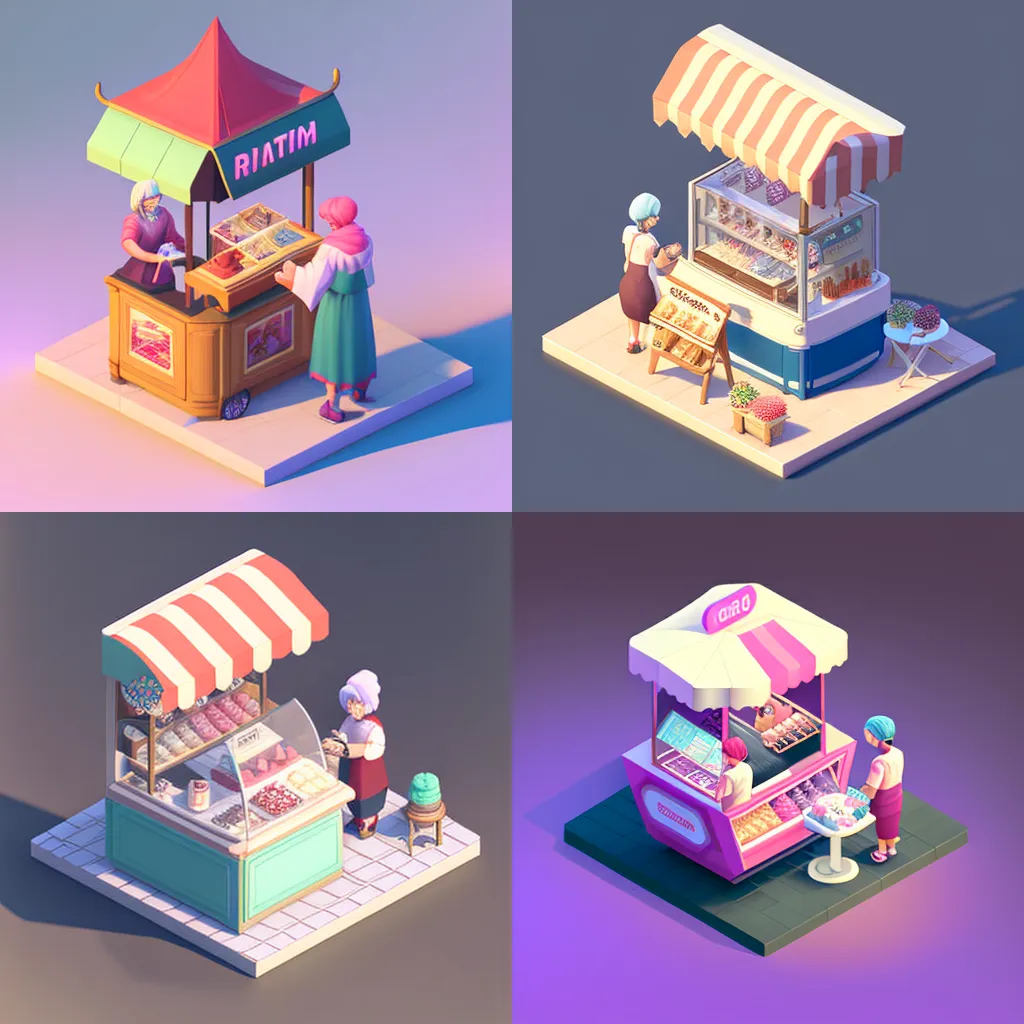 Prompt: 3d 32-bit isometric anime ice cream stand with an old woman— v 4