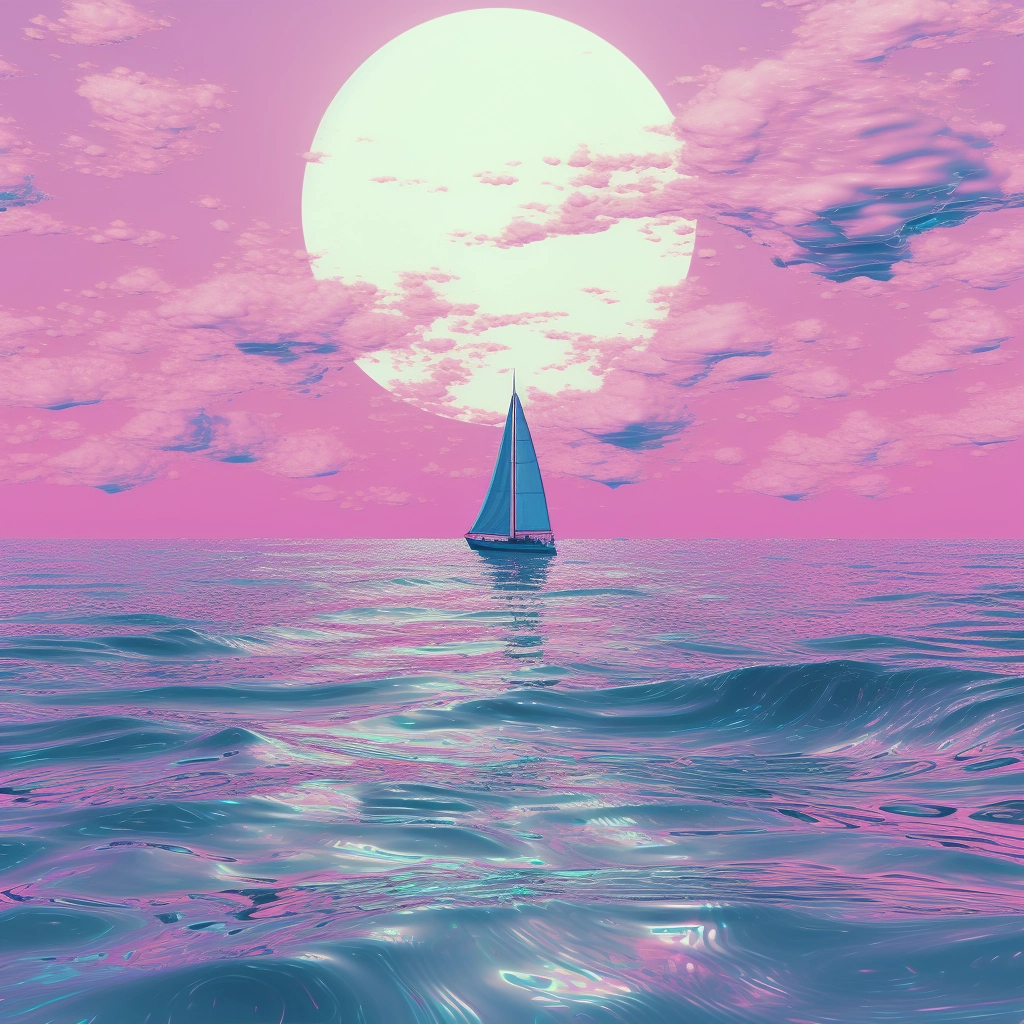 Prompt: vaporwave an ocean scene with a full moon and a sailboat in the distance