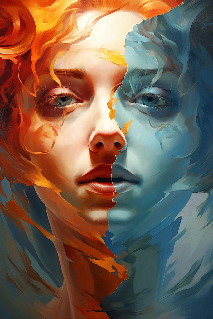 Prompt: Surreal oil painting of a beautiful woman looking in the mirror but her reflection is a distorted and unsettling, evocative and striking composition chaos 15--ar 2:3